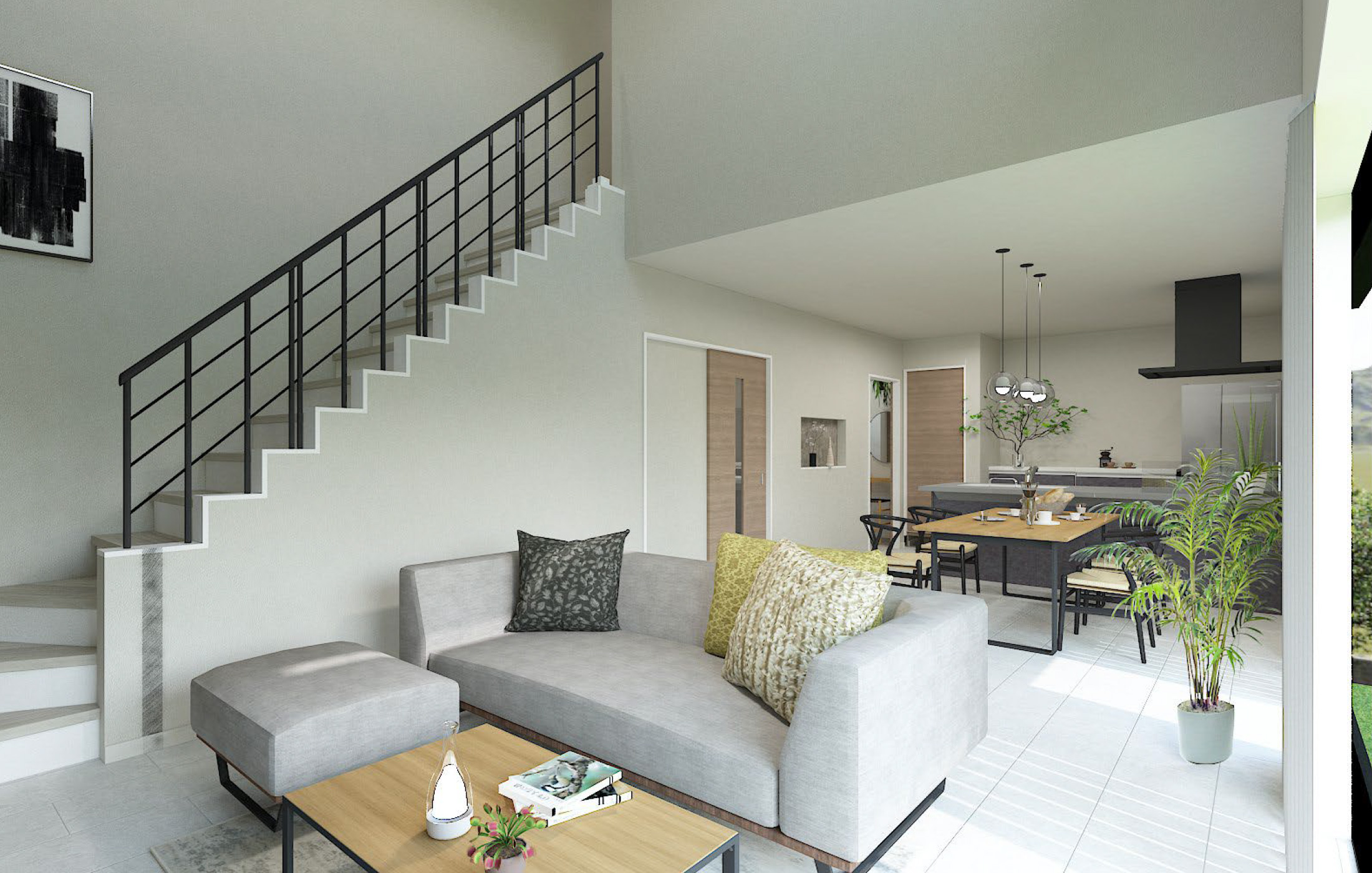 吹き抜けやリビング階段が生み出す抜け感のある心地よい空間。回遊動線が生み出すスムーズな暮しを実現した住まいです。