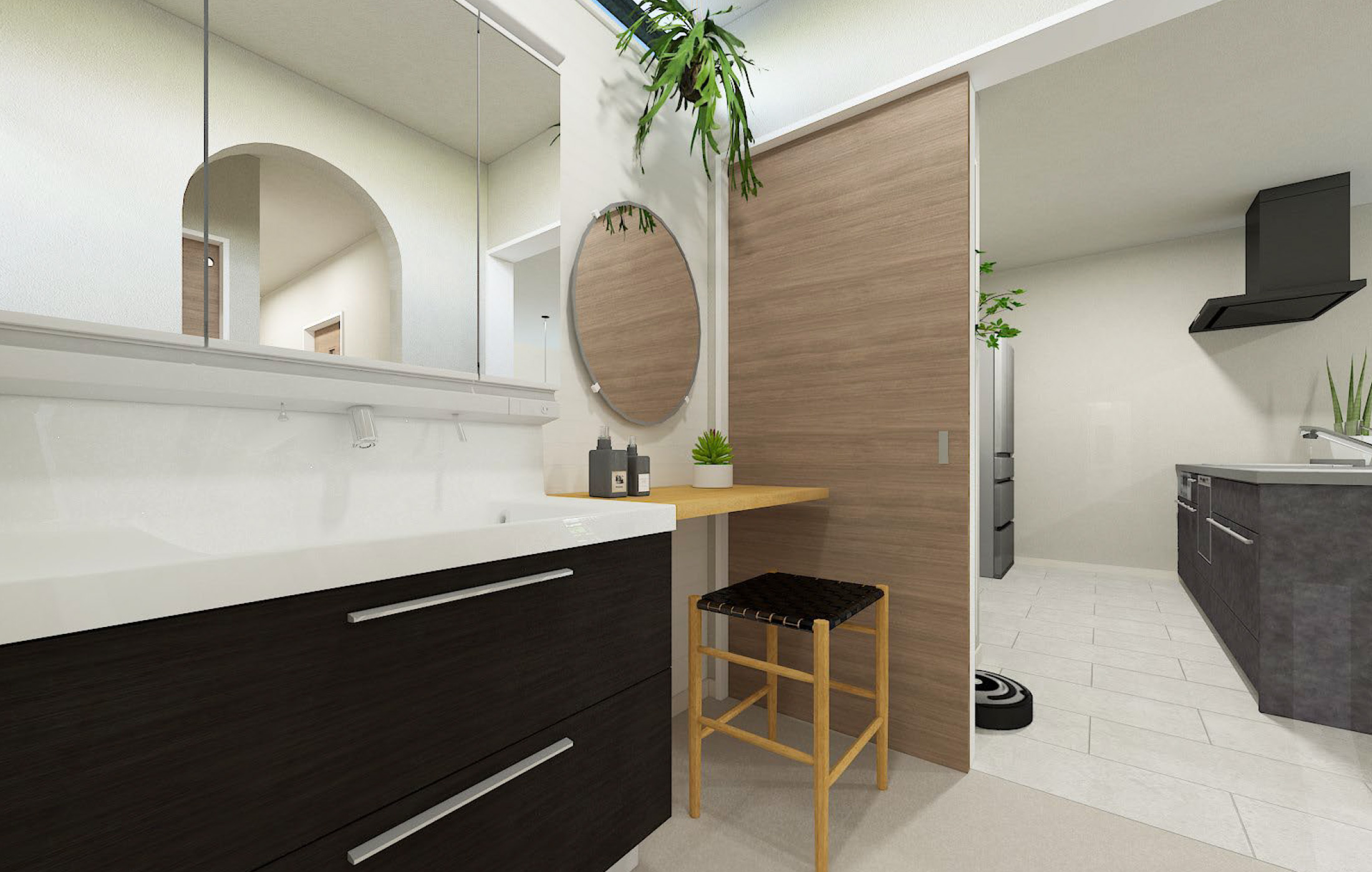 洗面台の横には奥様のメイクルームとなるカウンターを備え、慌ただしい朝の用意も時短できます。