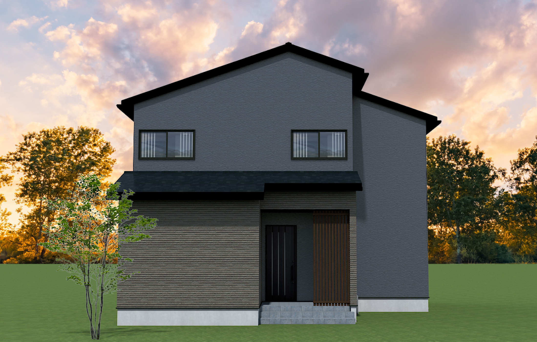 少しブルーがかったダークグレーの外壁のクールな外観。