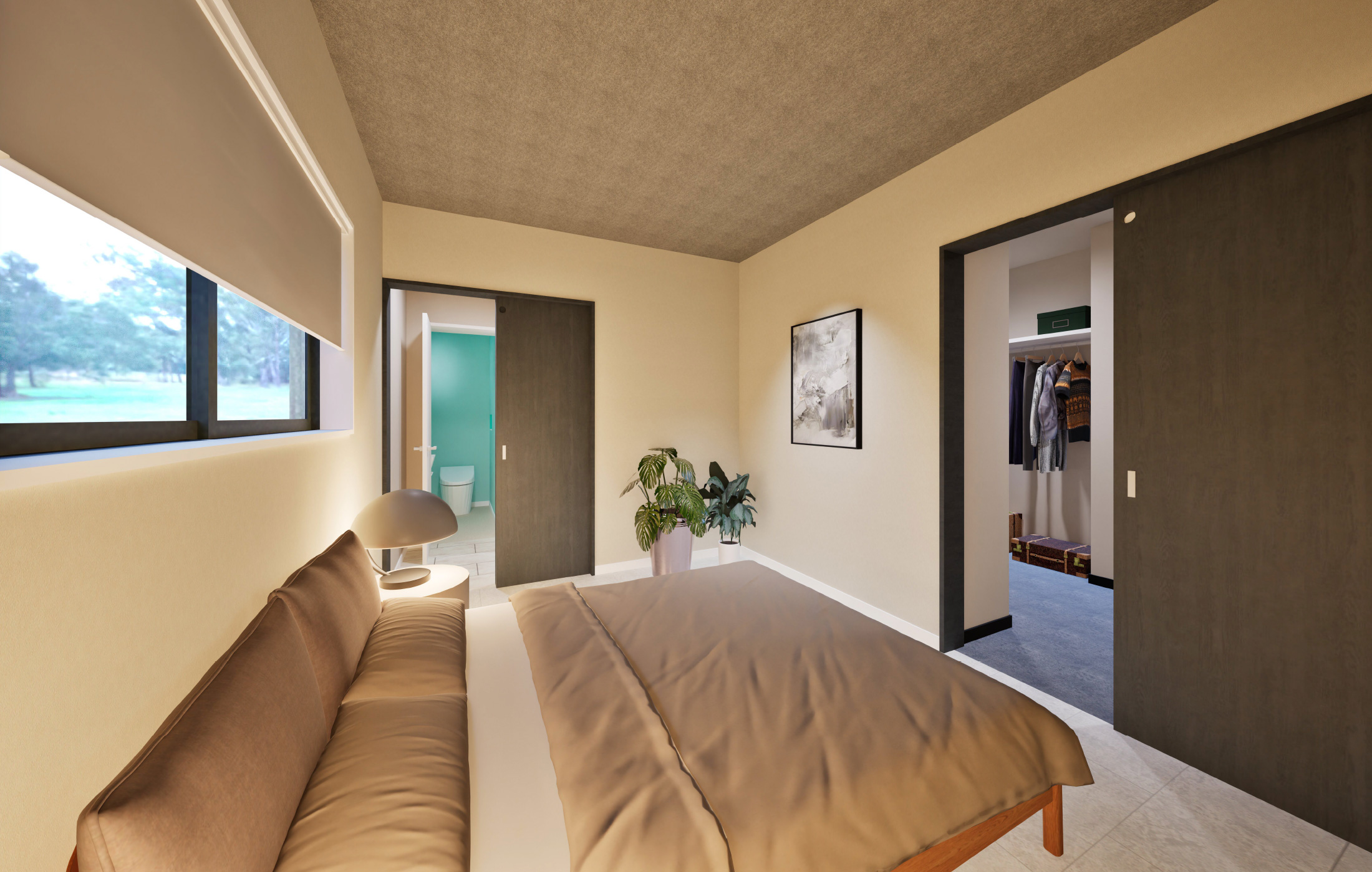 1階主寝室で、平屋のようにワンフロアで生活を完結できる暮し。