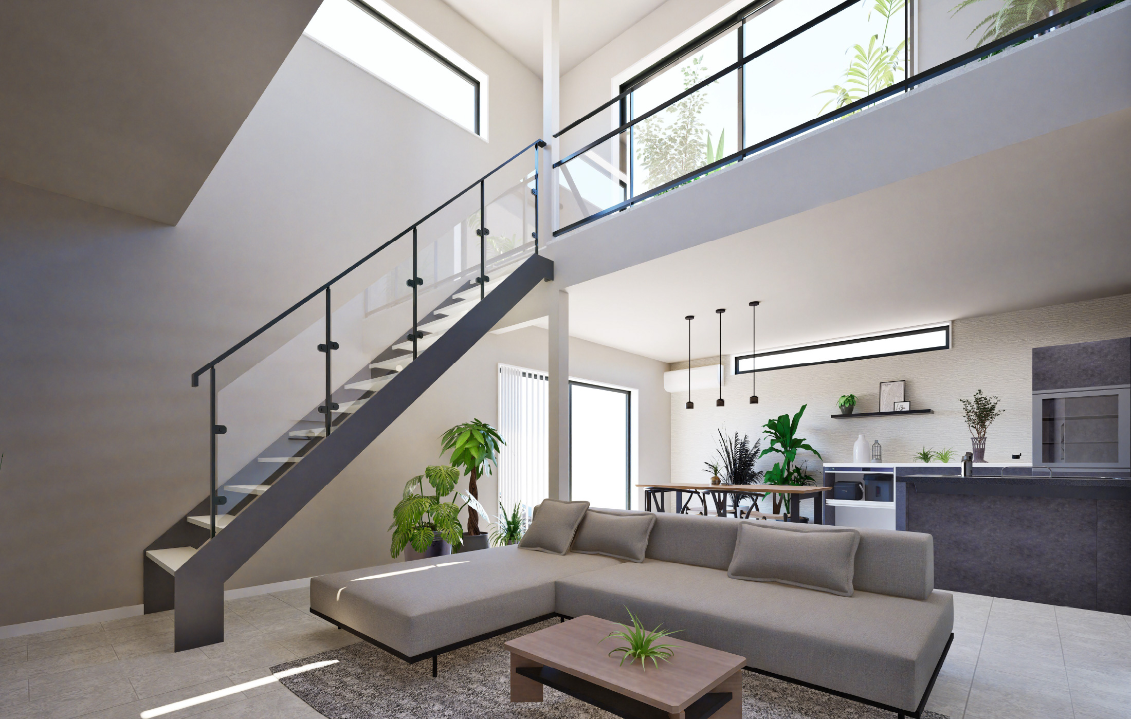 吹き抜けリビングに開放的なストリップ階段、2階のバルコニーへとつづく大きな窓から柔らかな光が降り注ぐ、明るく気持ちの良い空間となりました。
