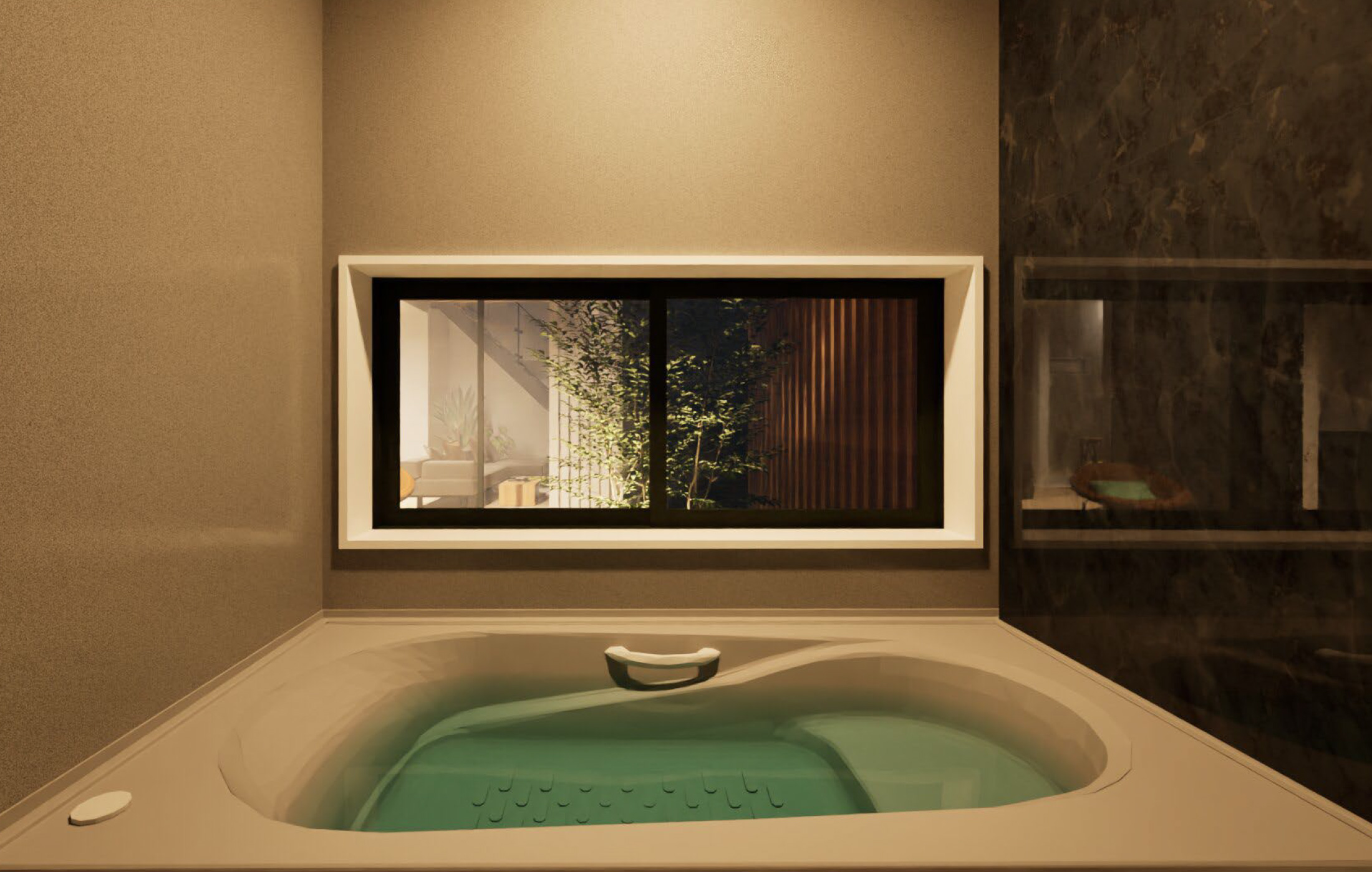 そして浴室には、大きな透明ガラスの窓が備えられており、湯船につかりながら中庭の風景を眺める露天風呂感覚を味わえます。もちろん、ルーバーが外から目線を遮ることで完全プライベートな空間となっています。