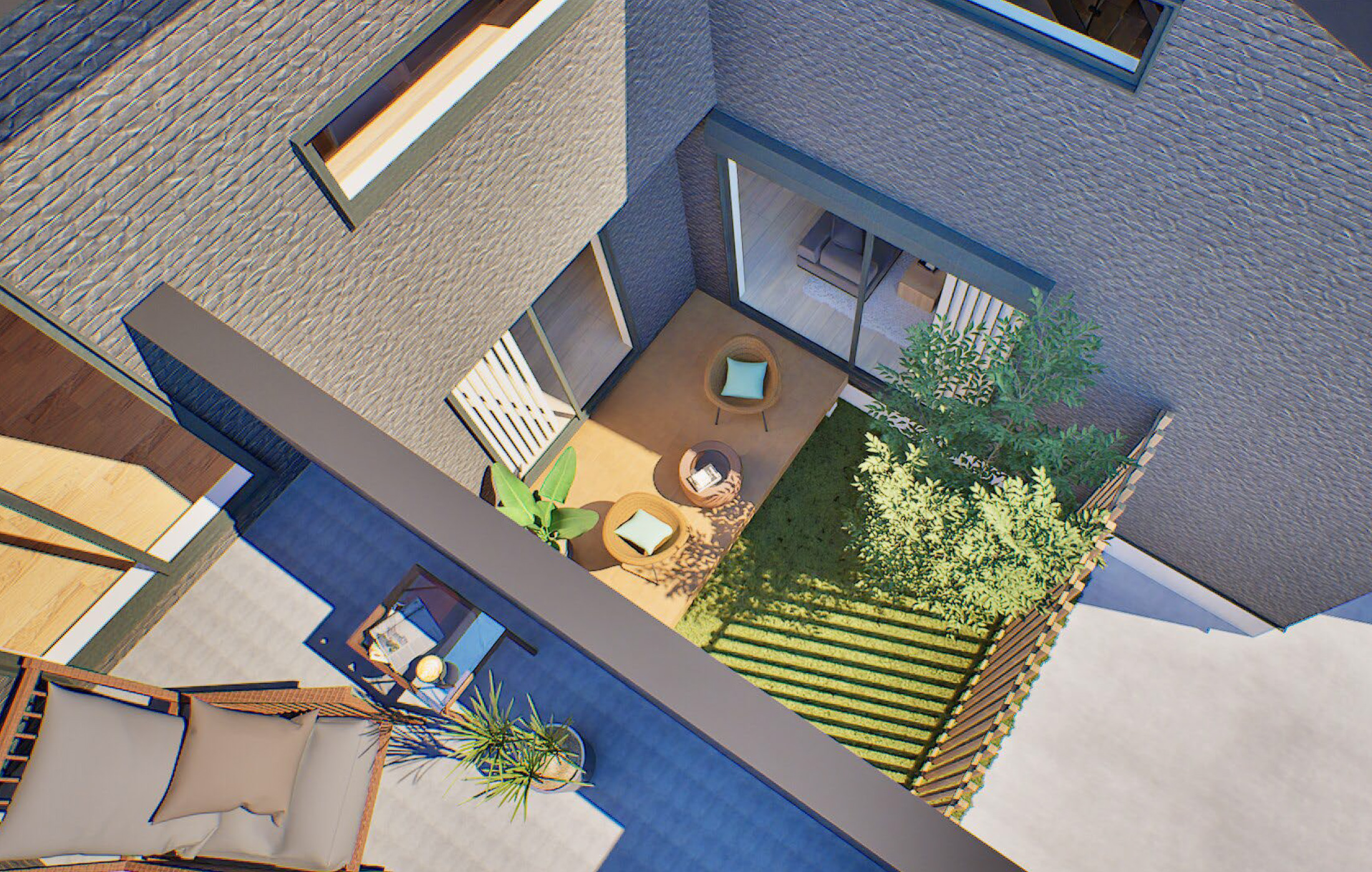 コの字型の建物が中庭を囲むように建ち、プライバシーを確保しながら開放感溢れる暮しを実現しました。
