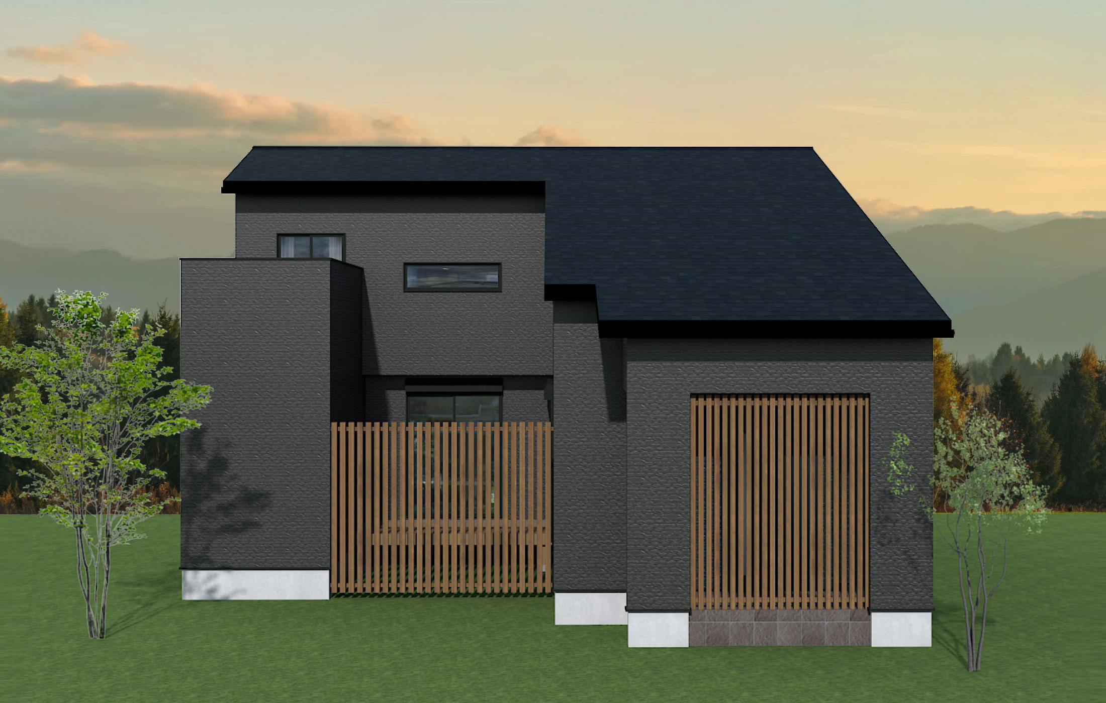 ダークグレーの外壁にウッドのルーバーを組み合わせた、和の佇まいを感じさせるモダンな外観。