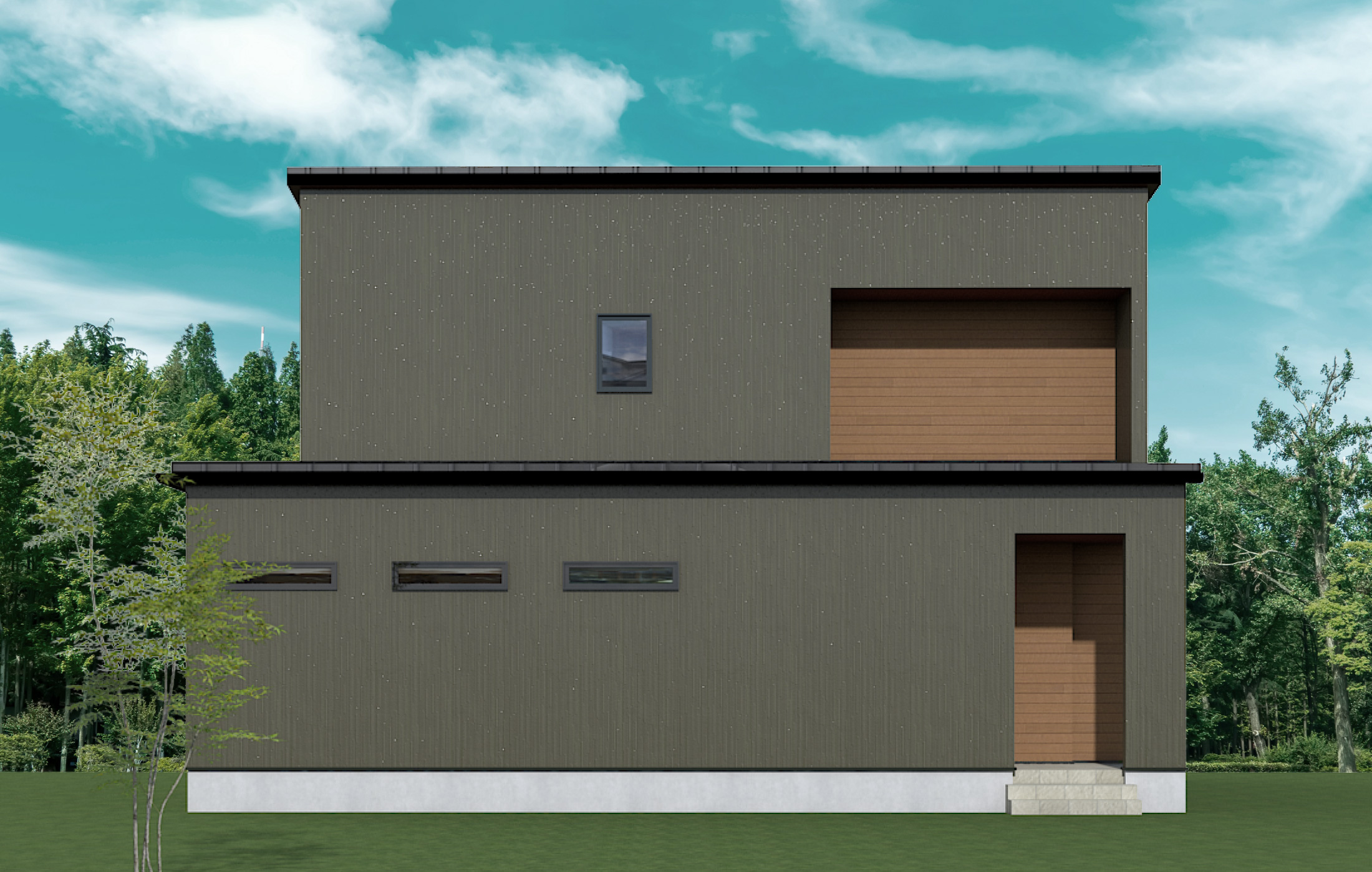 シンプルでスクウェアなフォルム。少しグリーンがかったグレーの落ち着いたカラーの外壁と、ウッドのブラウンとの組み合わせが優しい印象です。