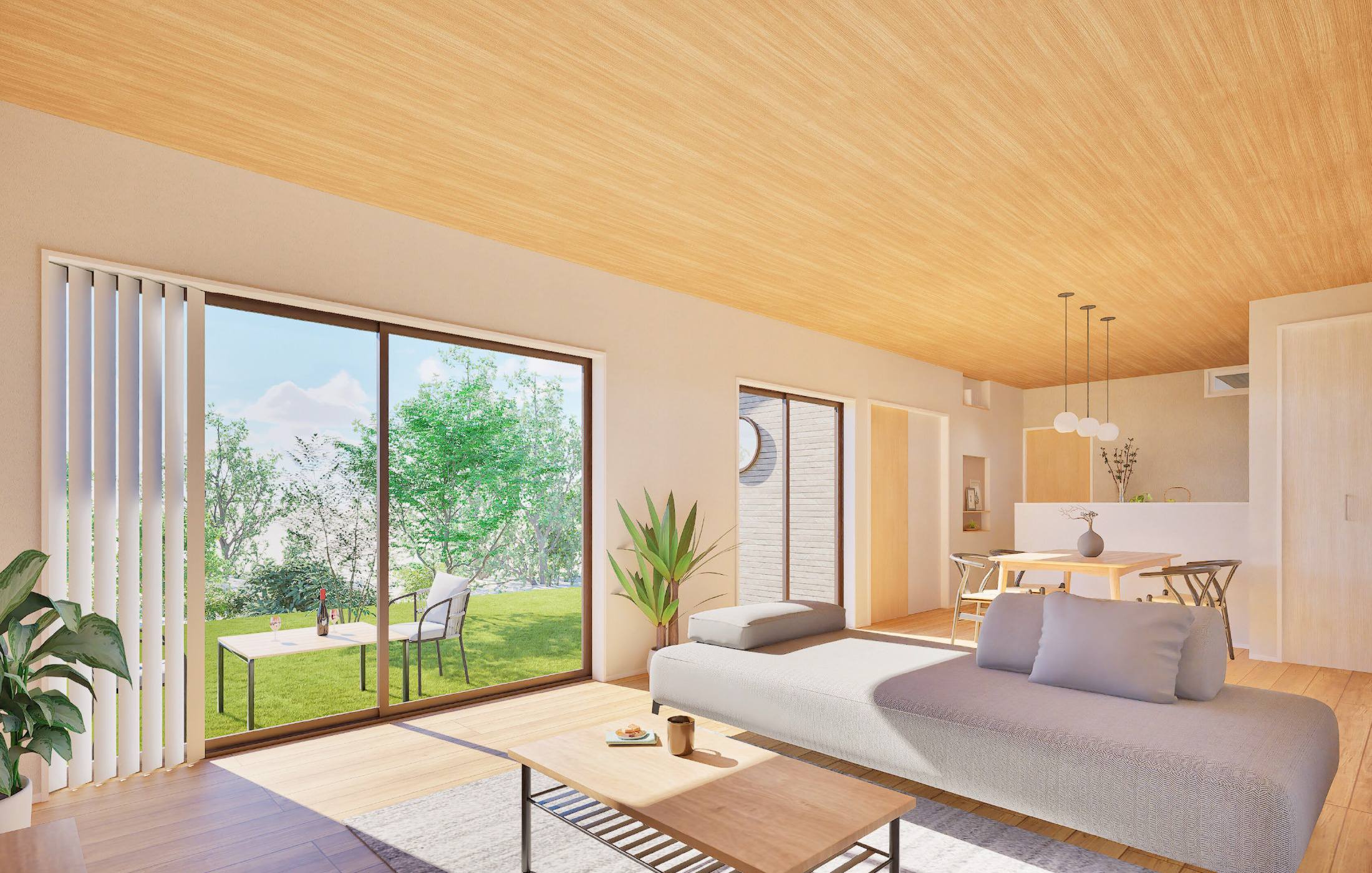 玄関ホールを抜けると約21帖の広いLDK。南向きの窓からの明るい日差しが心地よい、ご家族の憩いの場所です。
