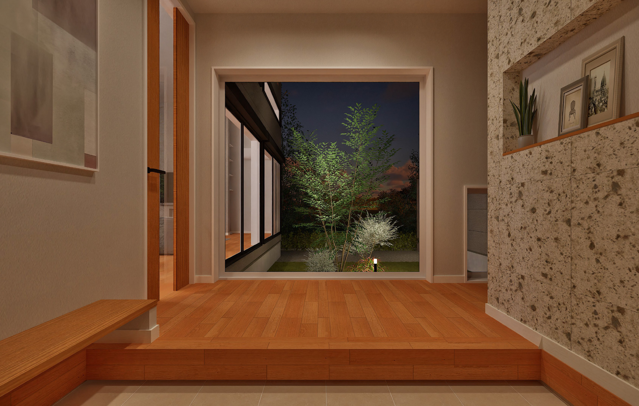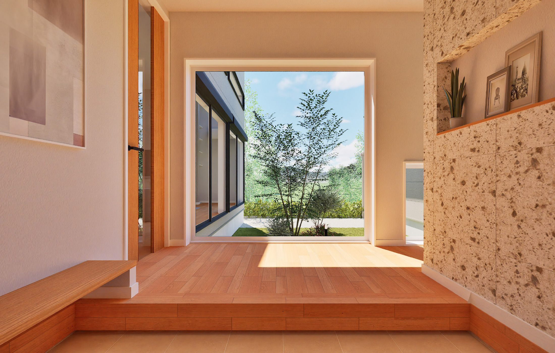 建物の中央に配置された玄関を開けるとまず目に入るのは、中庭の美しい景色を切り取ったピクチャーウインドウ。