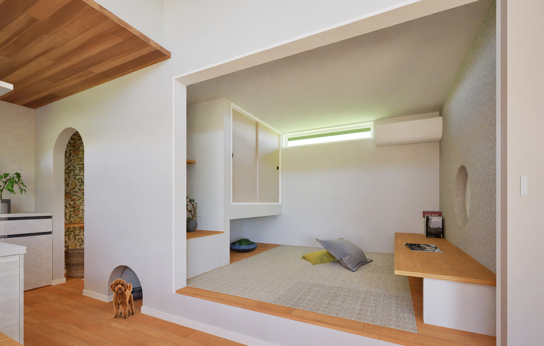 そして和室の隣のアーチ開口の中には、ご兄弟の愛犬・ナッツちゃん専用スペースも設けられていて、ご夫婦の優しい心遣いがうかがえます。