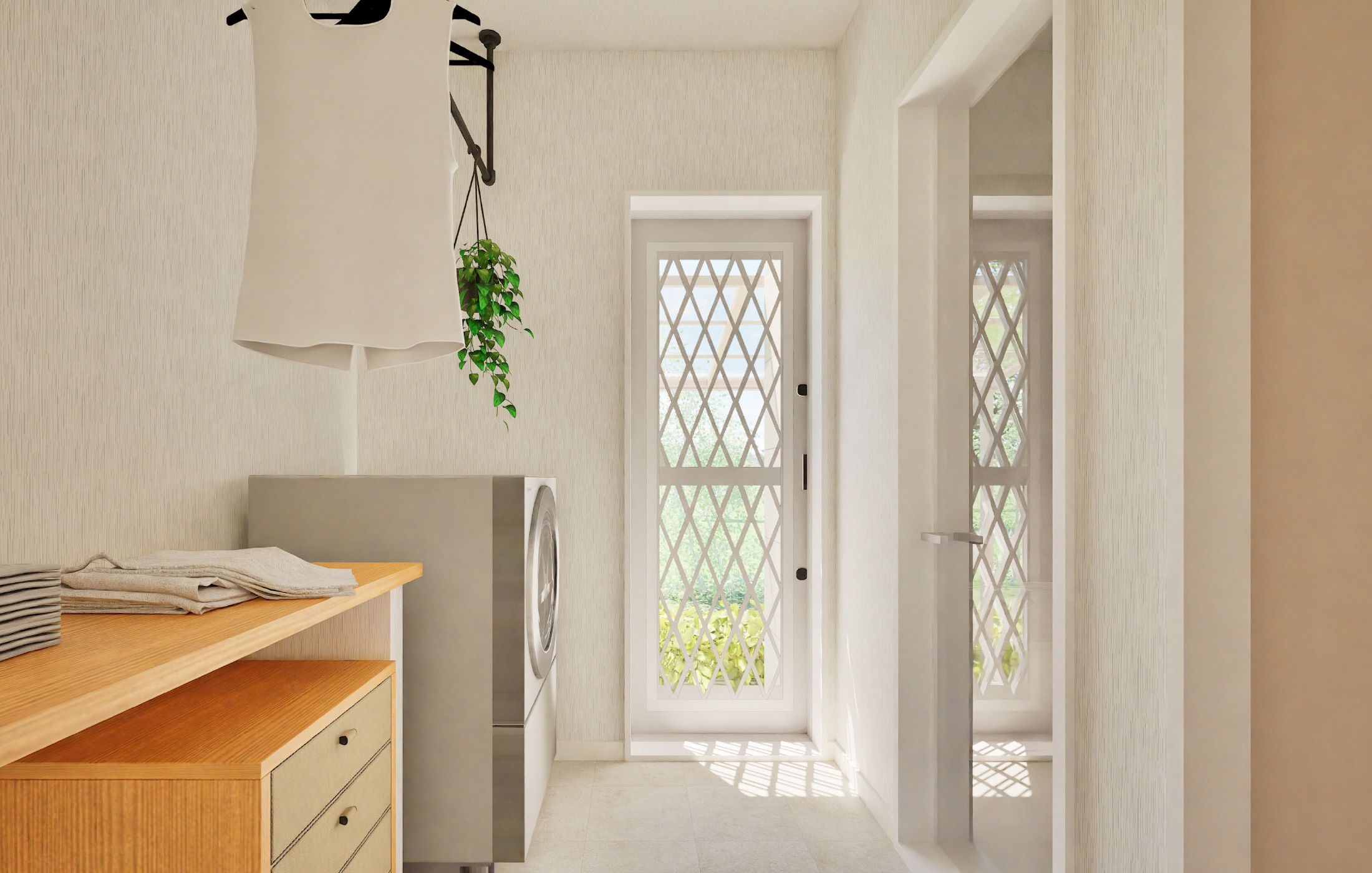 さらに、外からランドリールームに直接入れる入口が設けられており、お子様と一緒に楽しい外遊びをして、汚れた衣類はそのままお洗濯。そして浴室へザブンという流れるような動線です。