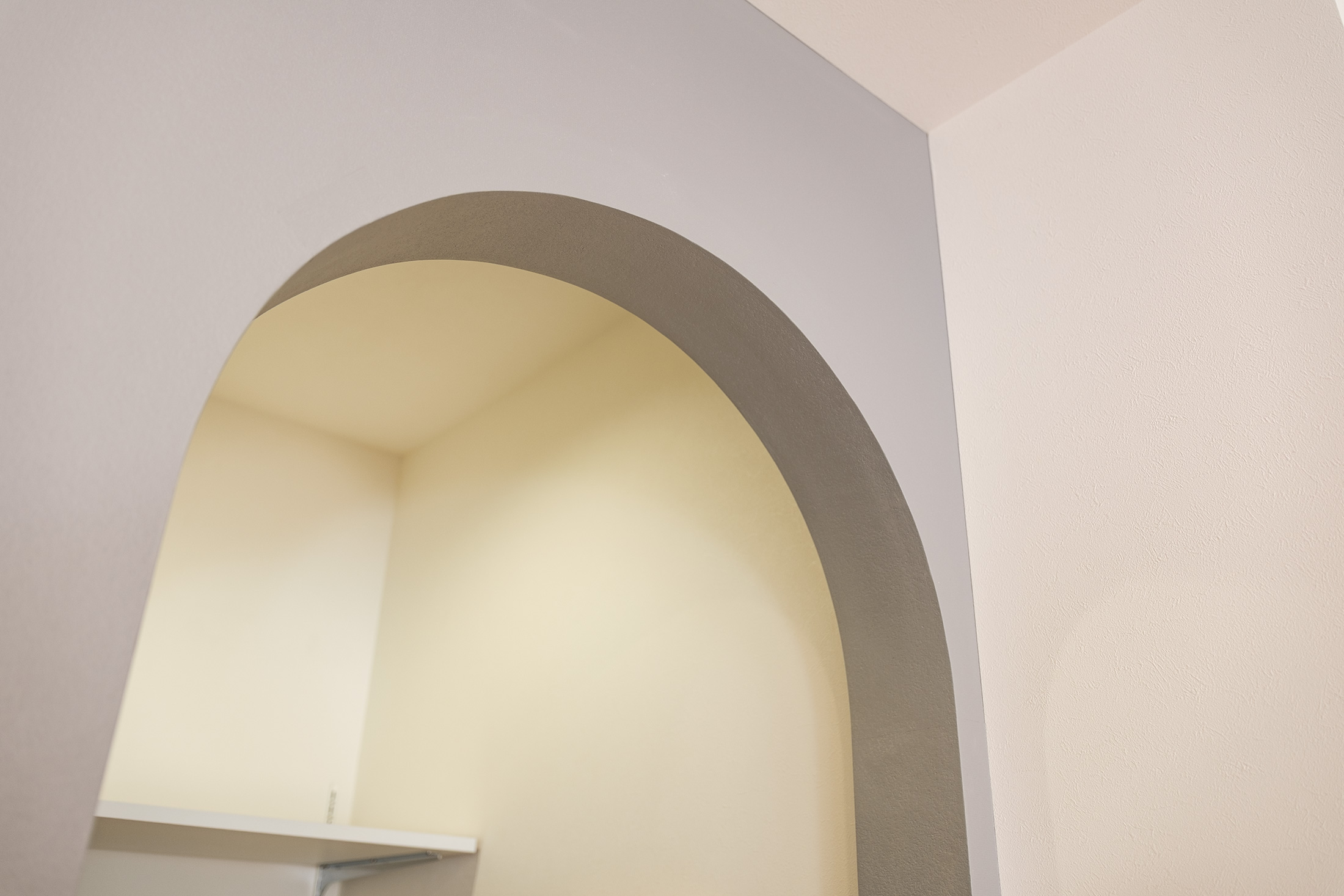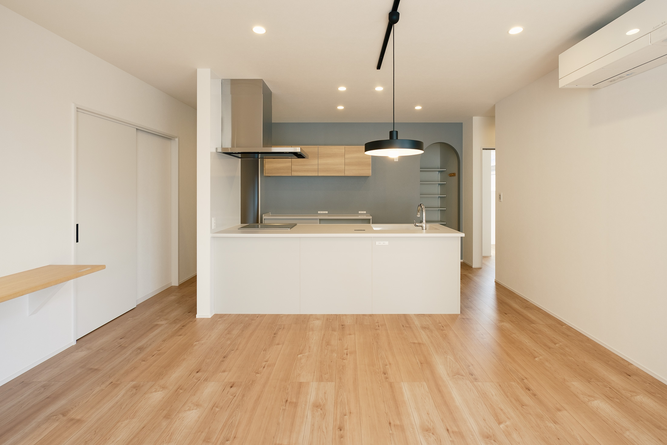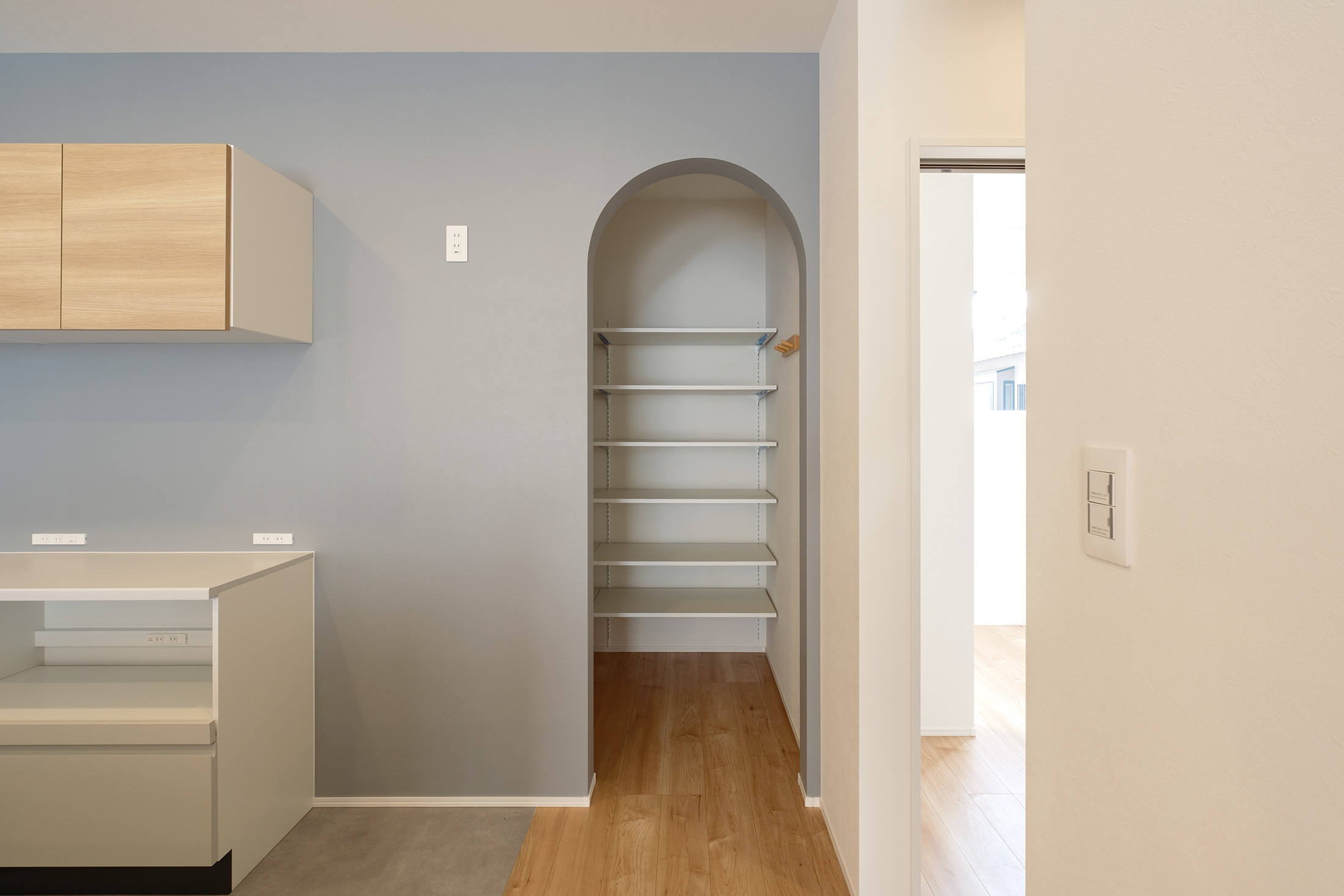 キッチンにはR開口の素敵なパントリーが備えられ、食材や日用品のストックがきれいに収納できます。