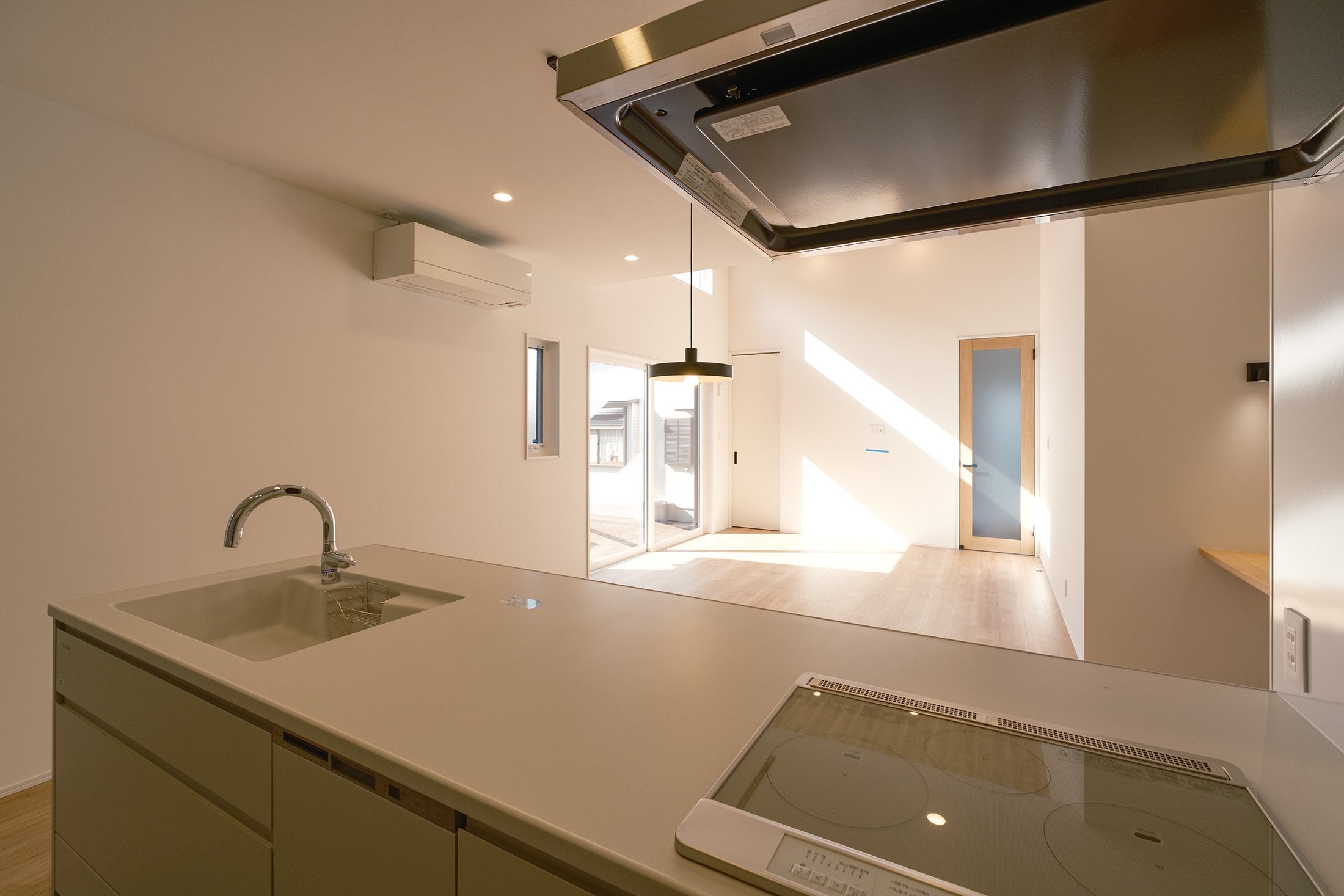LDKは、約21帖の奥行きを感じる広々空間。リビング部分は約3.5mの高天井で、南向きの高窓からは明るい日差しが入ります。